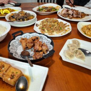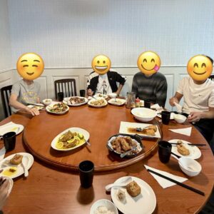 集まった生徒は全部で14人。そのうち男子が10人なので、モリモリ食べてもらうことを想定してなんと10品のコースが2つの円卓にずらっと並びました!当オフィスメンバーが特におすすめするメニューは、ナスと牛ひき肉のあんかけ炒め(すべての具のバランスが絶妙)やレモンチキン(こちらも激ウマ)なのですが、お店のスペシャリティの茹で餃子や三種盛りのお肉のローストや、香ばしいチャーハンなどもみんな「おいしい〜!」と楽しそうに食べていました。リカトンは中華をはじめとするエスニック料理のお店が多いエリアですが、このBensonには初めて来ました!という生徒もいました。新しいお店の発見にも、役立ったかもしれません⁉︎